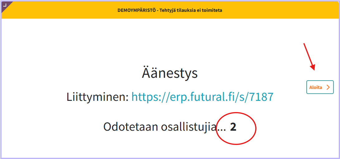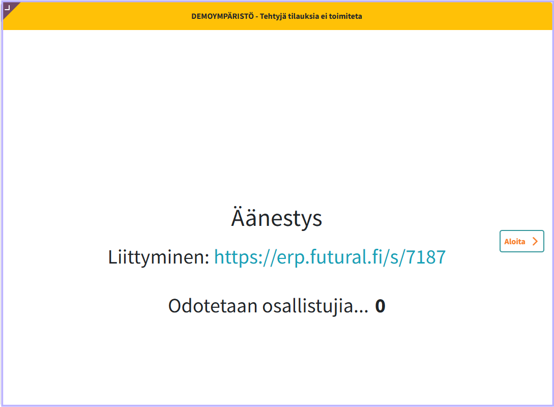 Kun äänestyksen aika on, kyselyn hallinnoija klikkaa Luo live-istunto. Uuteen välilehteen avautuu linkki äänestykseen: