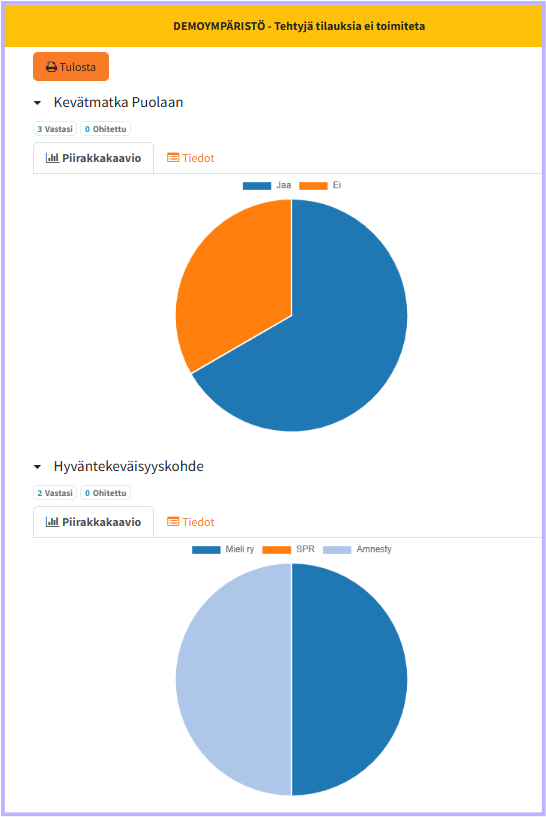 Vastaukset näkyvät kyselyn hallinnoijalle reaaliajassa. Session sulkemisen jälkeen vastauksia voidaan tarkastella graafisesti kyselyllä olevasta napista Katso tulokset, jolloin uuteen välilehteen aukeaa vastaukset kaaviomuodossa.