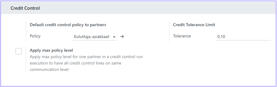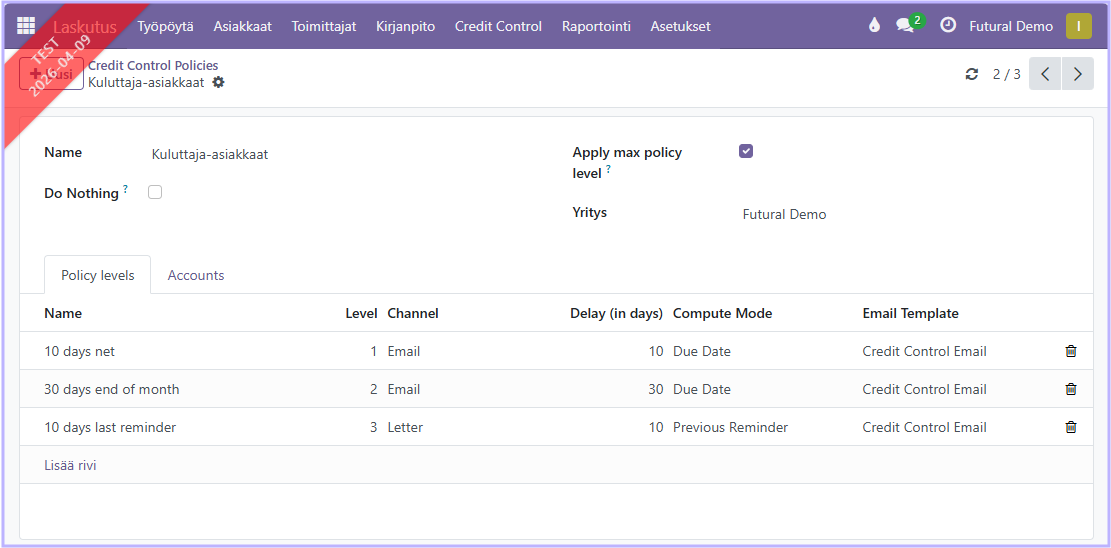 luotonvalvontakäytänteet konfiguroidaan menemällä Laskutus - Asetukset - Luotonvalvontakäytänteet /