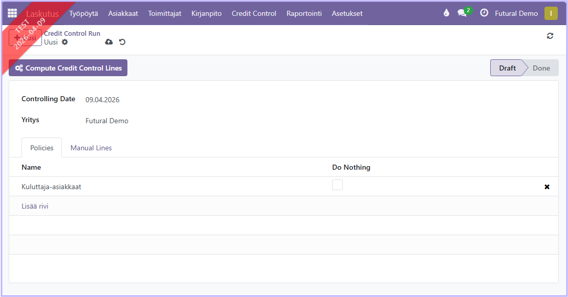 Paina lopuksi Laske luotonvalvonnan rivit / Compute Credit Control Lines