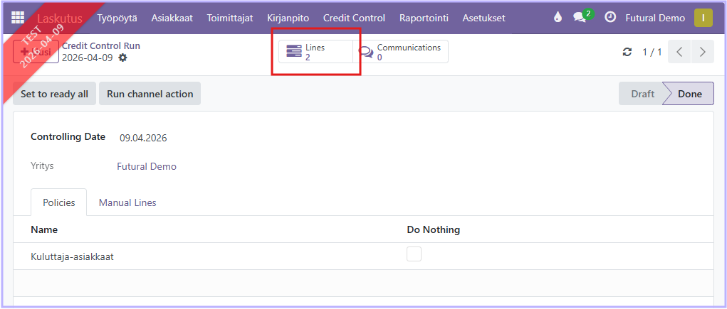 Luotonvalvonnan ajo luo rivit laskuille, joita käytänteet koskevat. Rivit näkyvät ajo-näkymässä sivun yläosan kuvakkeessa.