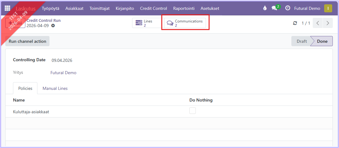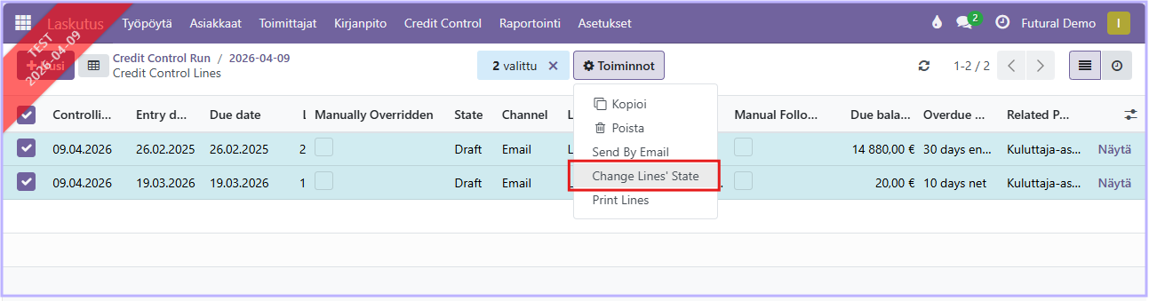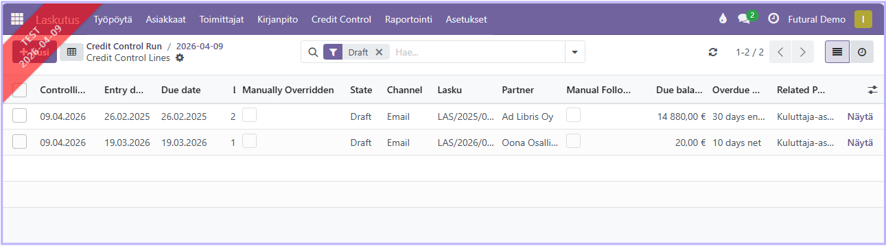 Futural-asennuksissa maksumuistutukset on toteutettu Odoo-yhteisön "Account Credit Control" -toiminnallisuudella.
