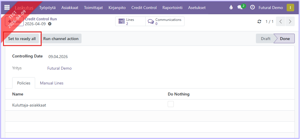Jos kaikille riveille voidaan lähettää muistutus, mene takaisin Rivien ajo -näkymään ja valitse Set to ready all, jolloin kaikki rivit siirtyvät tilasta luonnos/draft tilaan tehtävä/to do.
