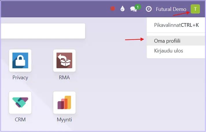 Sisäinen käyttäjä voi valita käyttämänsä kielen omassa profiilissaan, ruudun oikeassa yläkulmassa, kohdassa asetukset.