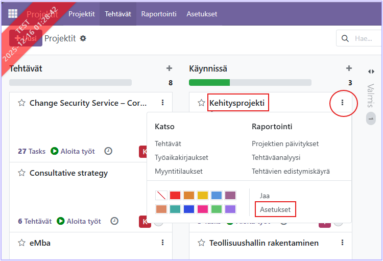 Projektin asetuksiin pääset projektinäkymästä kolmen pisteen takaa.