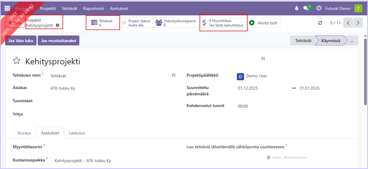 Kun projektille on määritetty Asetukset-välilehdellä Laskutettava, projektin tai sen tehtävien työaika ja mahdolliset materiaalit voidaan laskuttaa asiakkaalta. Kun tämä valinta on käytössä, projektilla kirjatut tunnit päivittyvät myyntitilaukselle.