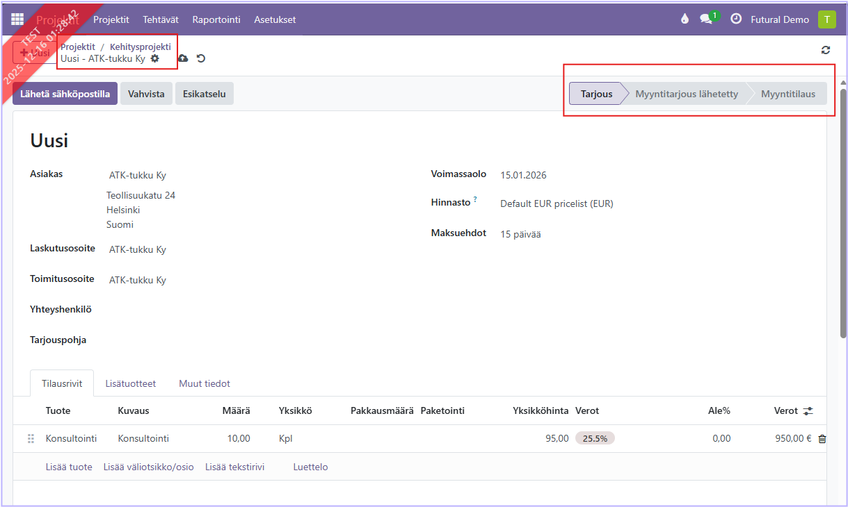 Järjestelmä luo ja avaa näkyviin projektiin liitetyn myyntitarjouksen. Vasemmasta yläreunasta näet polun, mistä tähän ikkunaan on päädytty. Voit klikkaamalla palata takaisin projektille. Oikealla taas nähdään myyntitilaukseen päätyvät vaiheet.