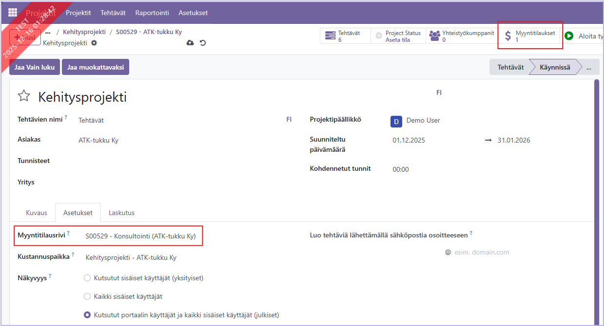 Palaamalla takaisin projektin asetuksiin, huomataan, että myyntitilaus on ilmestynyt näkyviin sekä Asetukset-välilehdelle, että yläosan symboleihin automaattisesti.