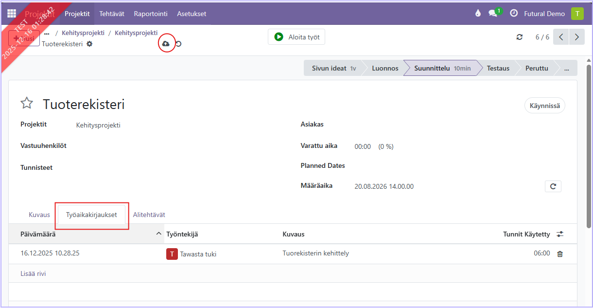 Kun projektin tehtävään käytetään työaikaa, tunnit kirjataan työaikakirjaukset-välilehdelle, tässä esimerkkitapauksessa kuusi tuntia. Muista tallentaa pilvi-symbolista.