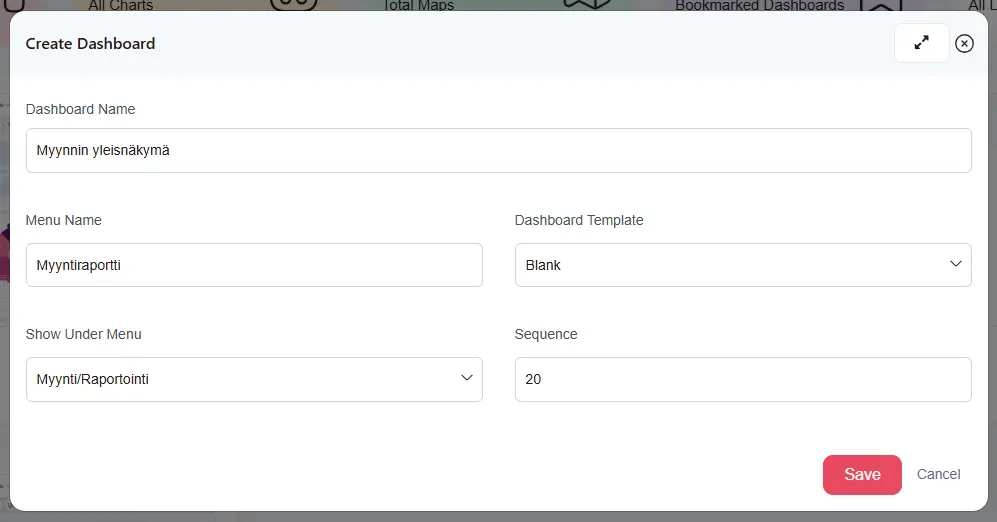 Aloita raporttien tekeminen aina luomalla uusi dashboard. Tallenna uusi dashboard haluamaasi valikkoon.