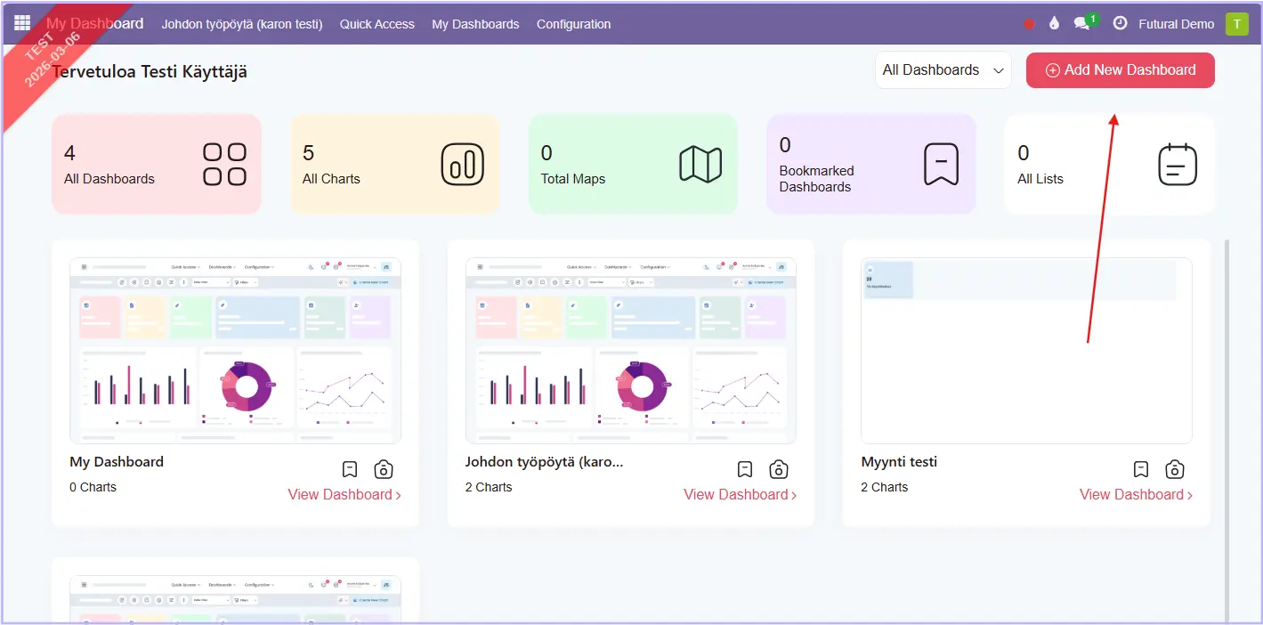 Uuden dashboardin pääsee luomaan klikkaamalla oikeassa yläreunassa kohtaa Add New Dashboard. Uuden dashboardin/työpöydän luominen tarkoittaa uuden "sivun" luontia, tätä tyhjää taulua aletaan täyttämään halutuilla raporteilla.