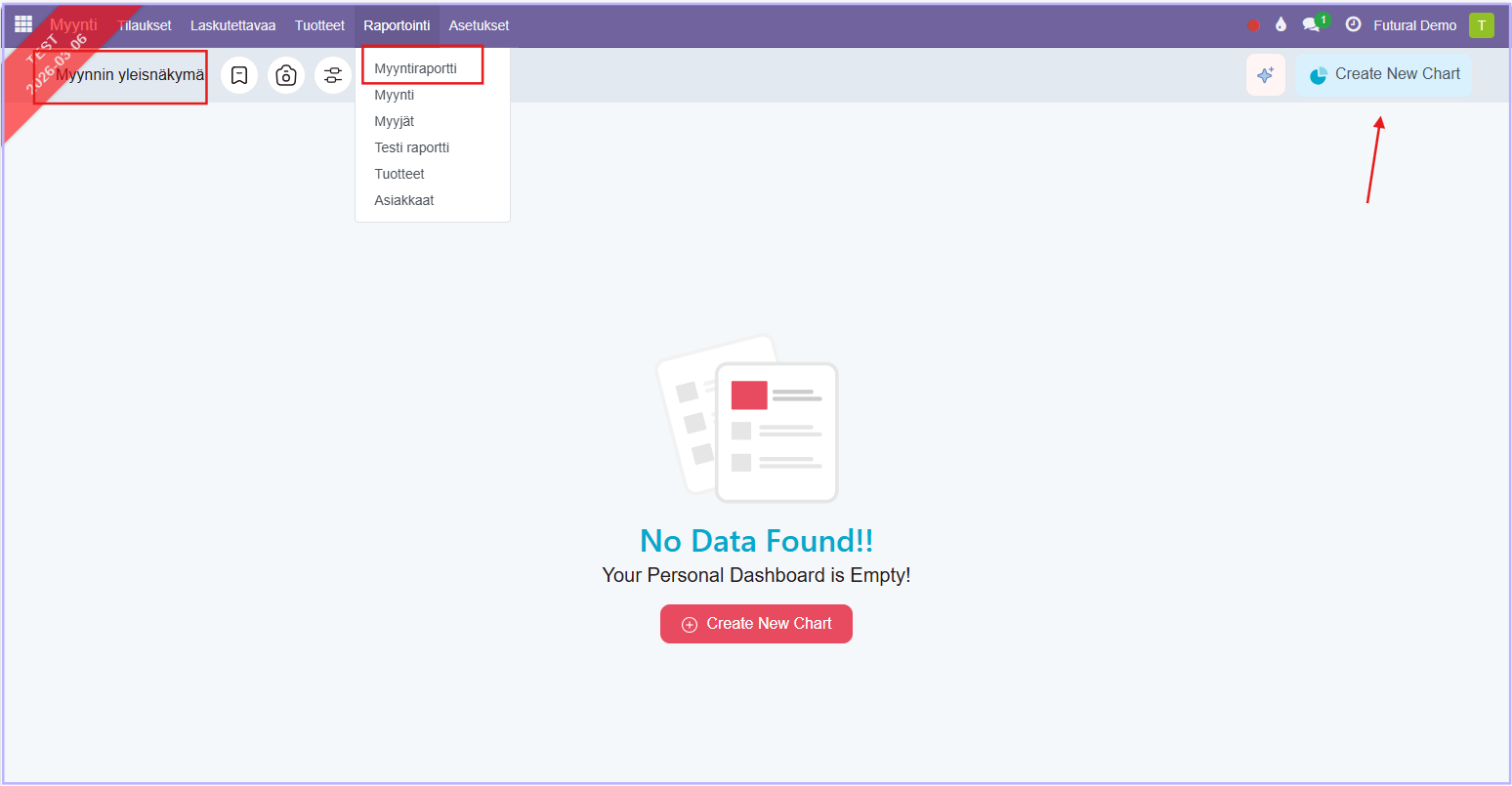 Lisää ensimmäinen raporttityyppi painamalla Create New Chart.