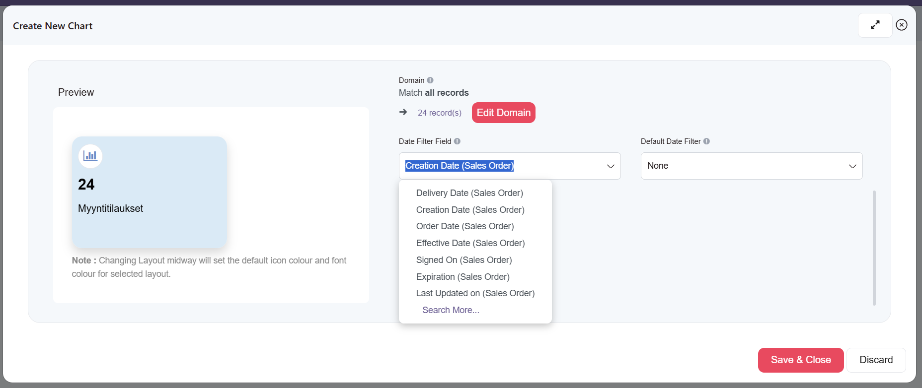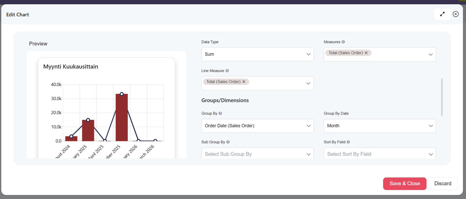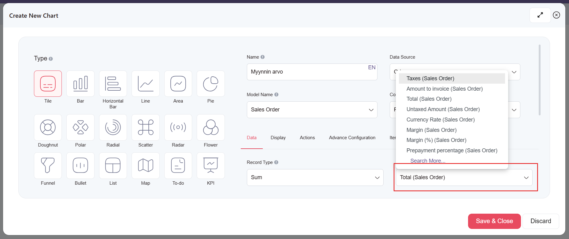 - Record Field: Minkä kentän arvo huomioidaan raportissa, nyt Total (Sales Order).