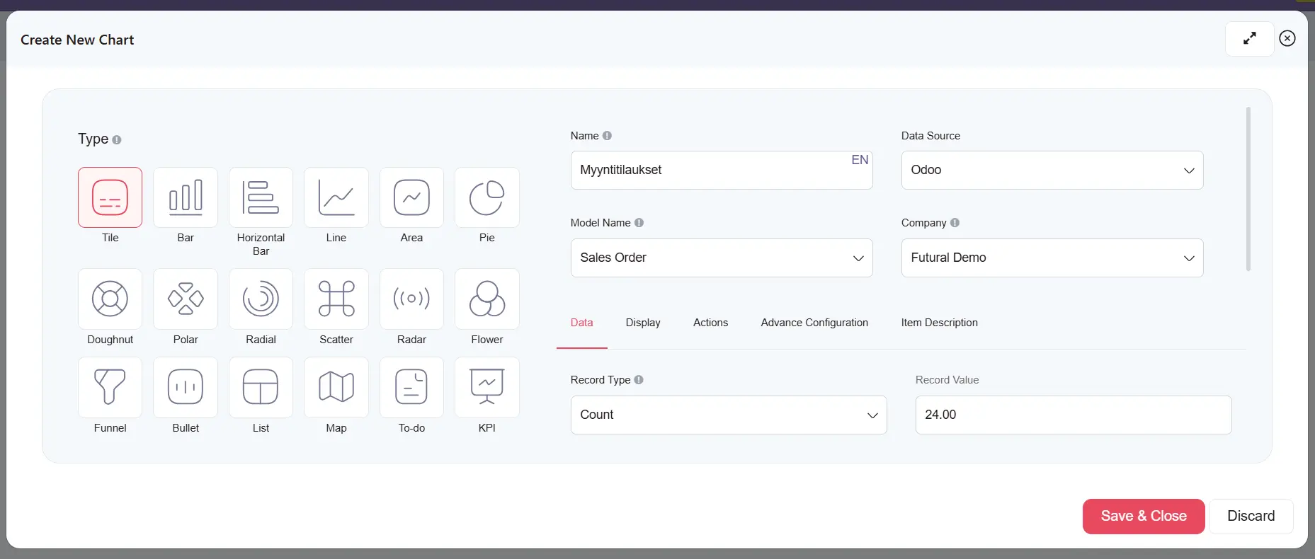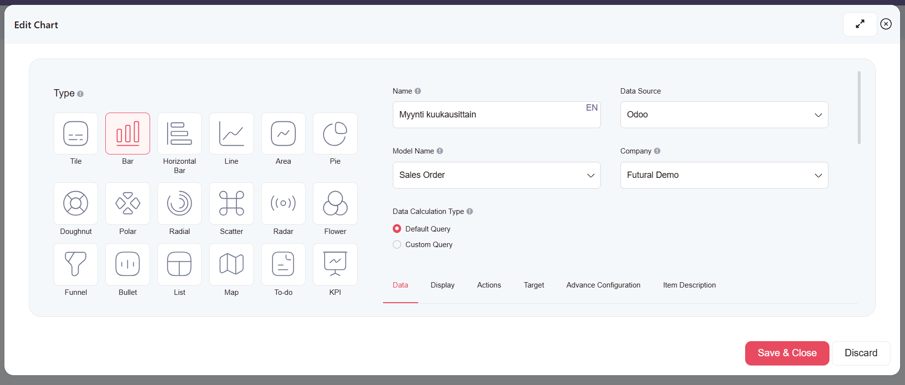 - Model Name: mistä näkymästä/moduulista tiedot haetaan