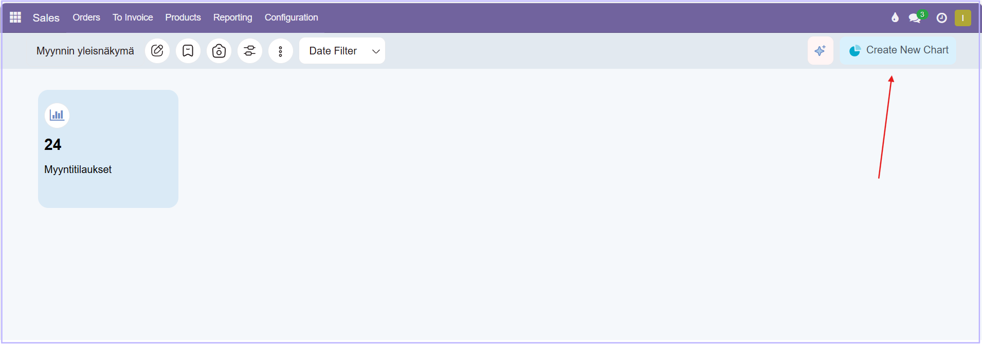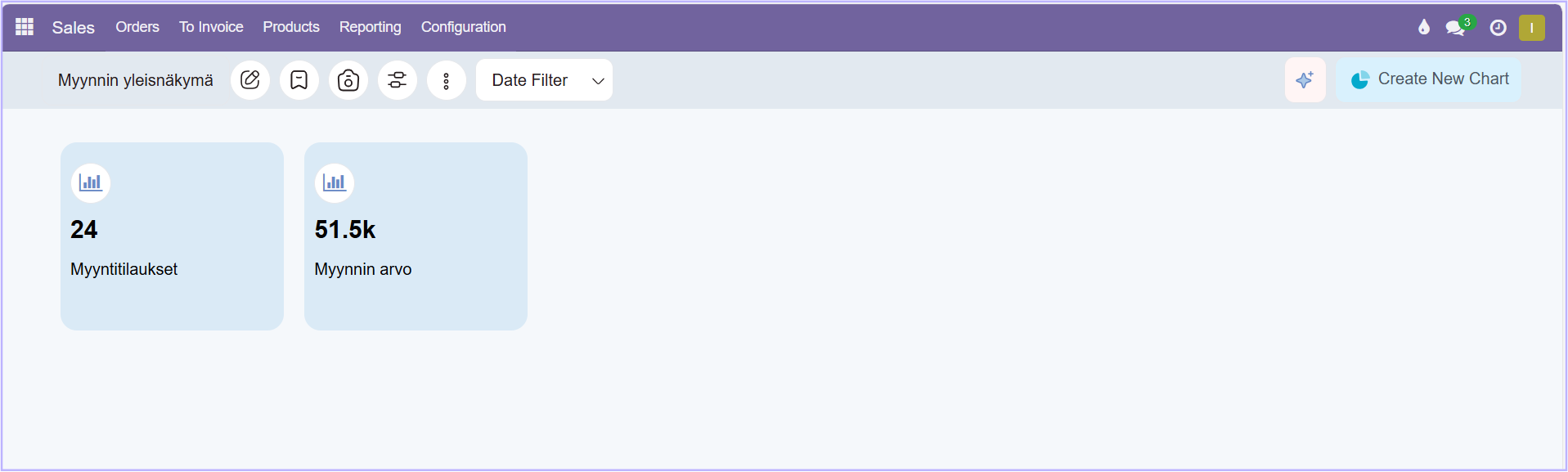 Ensimmäinen raportti näkyy nyt dashboardilla. Raportti näyttää kuinka monta myyntitilausta on tehtynä. Luodaan vielä uusi raportti.