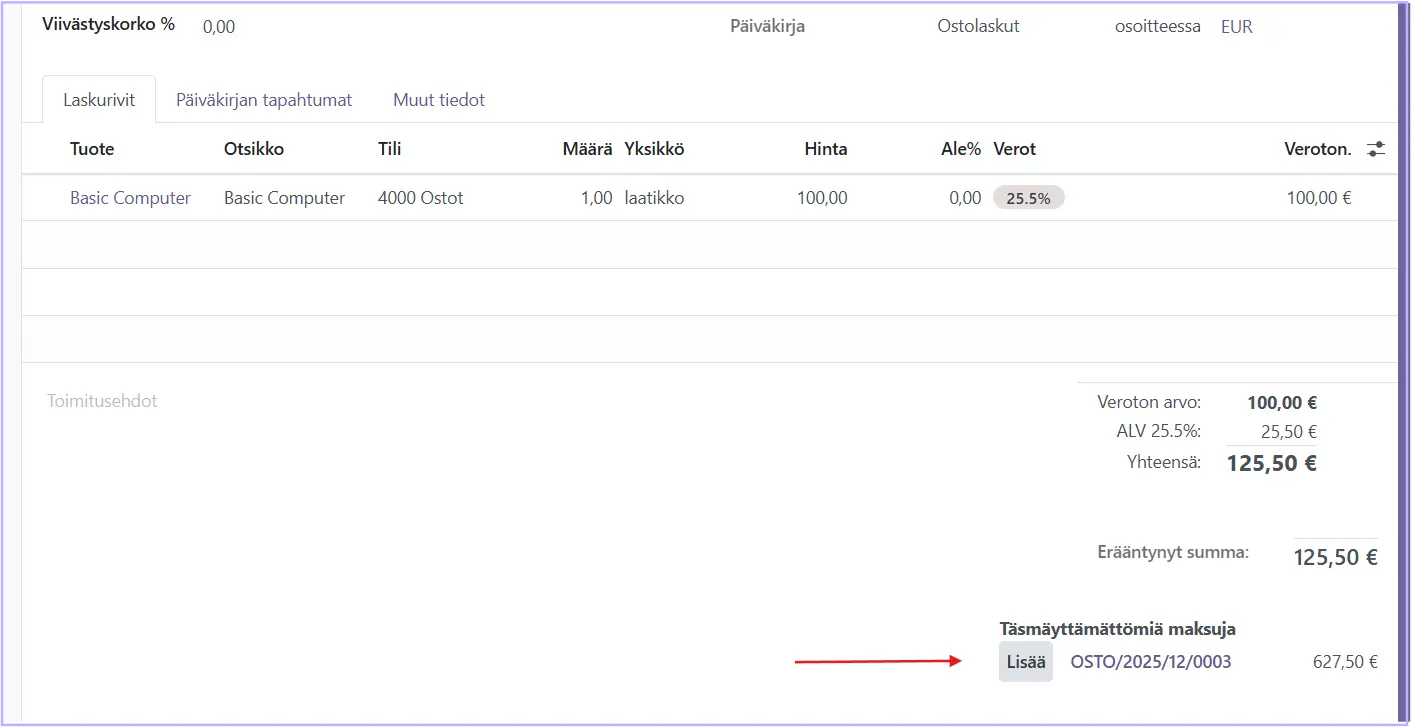 Voit täsmäyttää hyvityksen valitsemaasi laskuun painamalla Lisää haluamasi ostolaskun kohdalta (jos niitä on useampia).