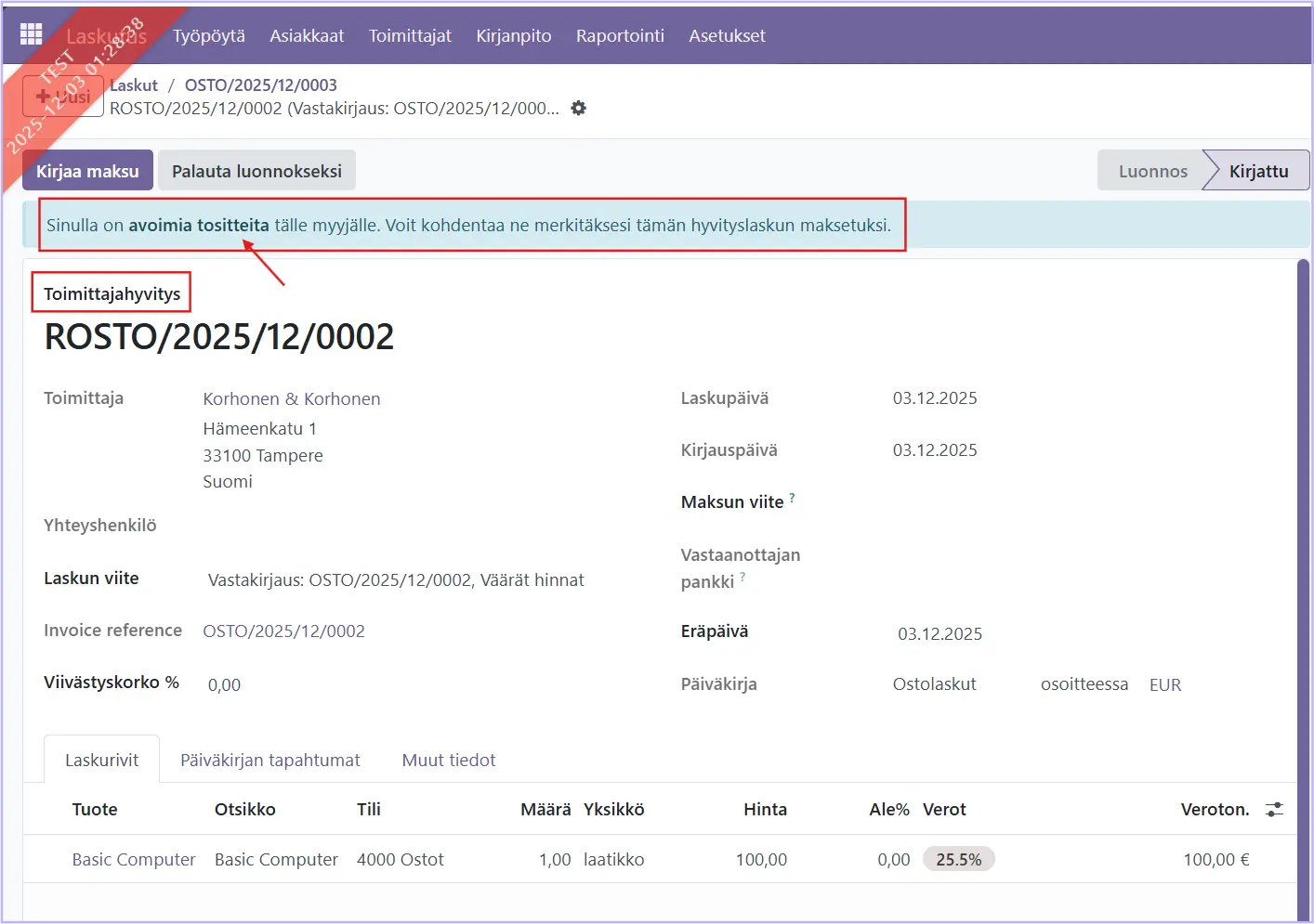 Järjestelmä ilmoittaa vahvistamisen jälkeen, että toimittajalle on maksamattomia laskuja (avoinna olevia ostolaskuja), joihin hyvitys voidaan kohdistaa.