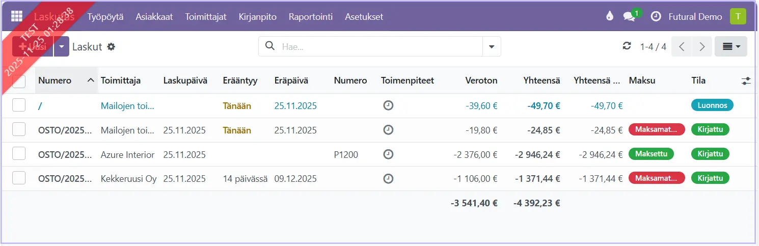 Ostolaskut löytyvät valikossa Invoicing/Laskutus - Vendors/Toimittajat - Bills/Laskut