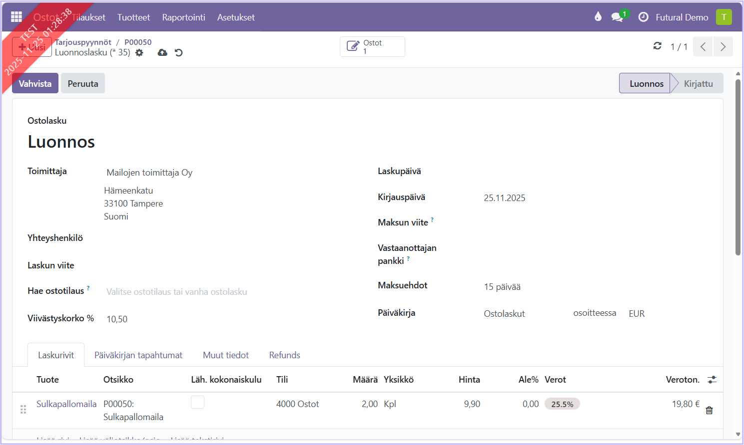 Odoo mahdollistaa integraation verkkolaskuoperaattorin kanssa, jolloin kaikki sähköisesti vastaanotetut ostolaskut siirtyvät automaattisesti Odoon ostolaskut-näkymään luonnos-tilaan. Avaa, tarkasta tiedota ja vahvista ostolasku.