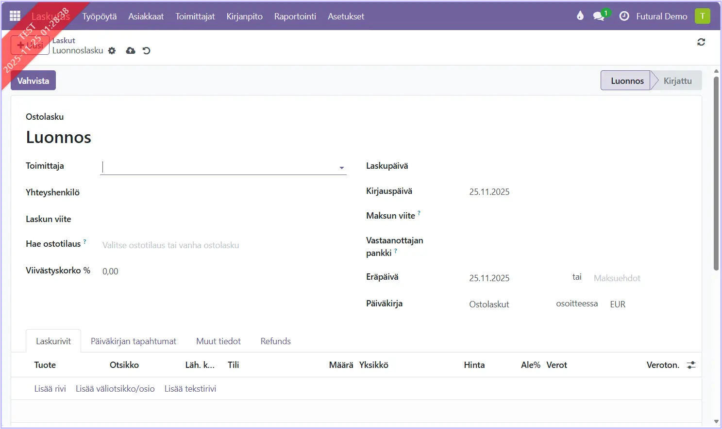 Painamalla Luo ostolasku, ohjelmisto avaa näkyviin uuden ostolaskun luonnos-tilassa.