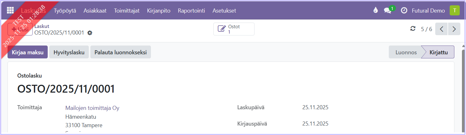 Kun vahvistat ostolaskun, muodostuu lasku Posted/Kirjattu ja Not Paid/Maksamaton -tilaan odottamaan maksua, ja laskulle generoituu laskunumero ja lasku- ja eräpäivä.