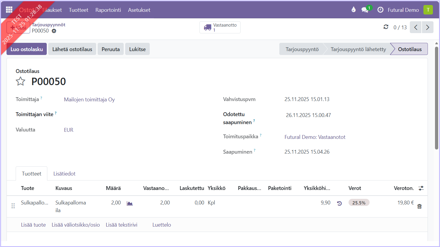 Jos haet ostotilauksen, täyttyvät toimittaja- ja tuotetiedot automaattisesti ostotilauksen tiedoilla.