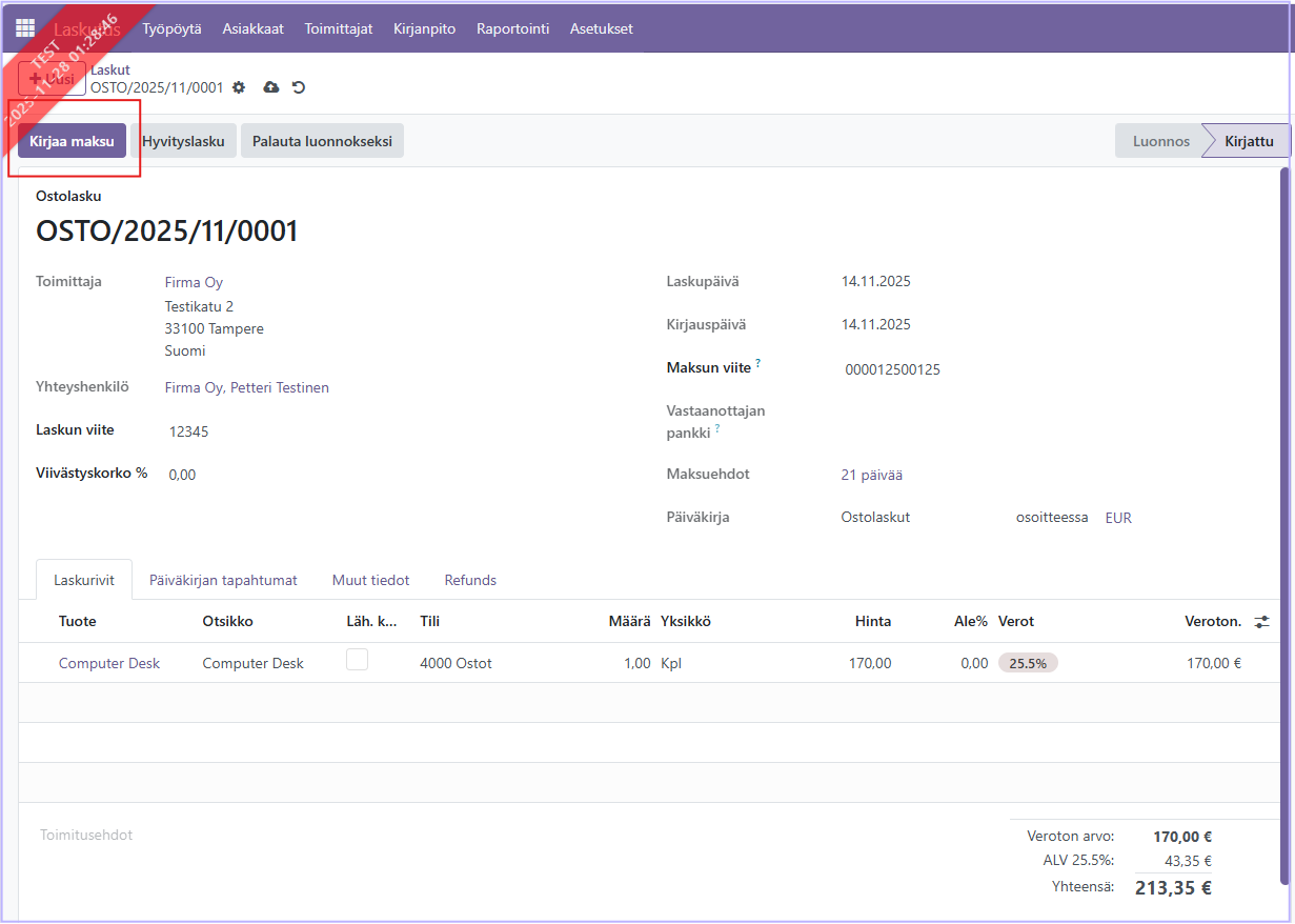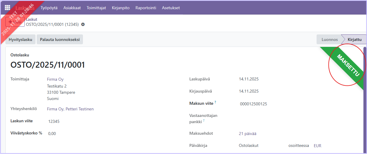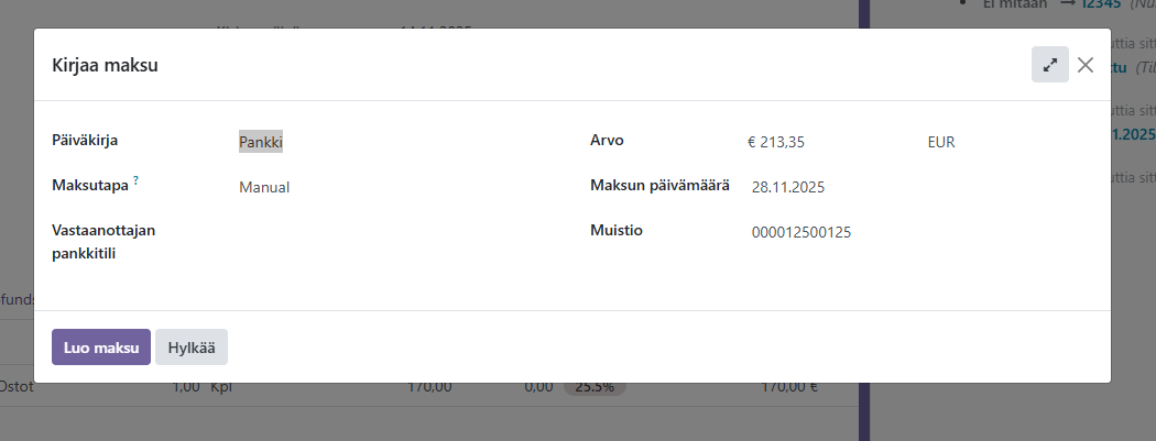 Kirjaa tiedot painamalla Luo maksu, jolloin ostolasku siirtyy Maksettu -tilaan.