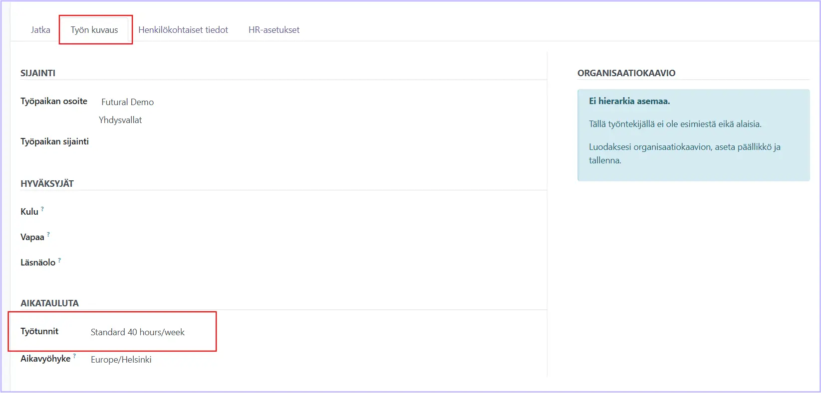 Henkilöön liitetään työntekijätiedoissa työaika. Siirry Työn kuvaus -välilehdelle, josta löydät kohdan Työtunnit.