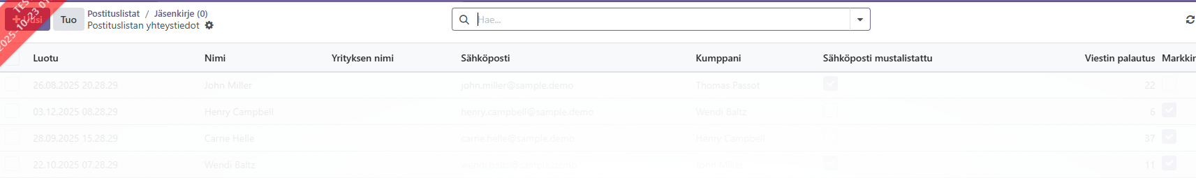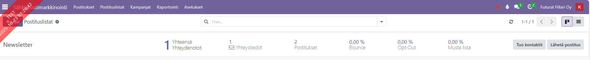 Postituslistat löytyvät näkymästä Päävalikko - Sähköpostimarkkinointi - Postituslistat - Postituslistat.