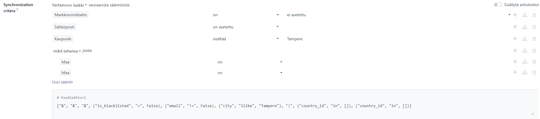 Ehtolistan oikeassa yläkulmassa näkyy, montako tietuetta kyseisellä suodatuksella tulisi postituslistaan.