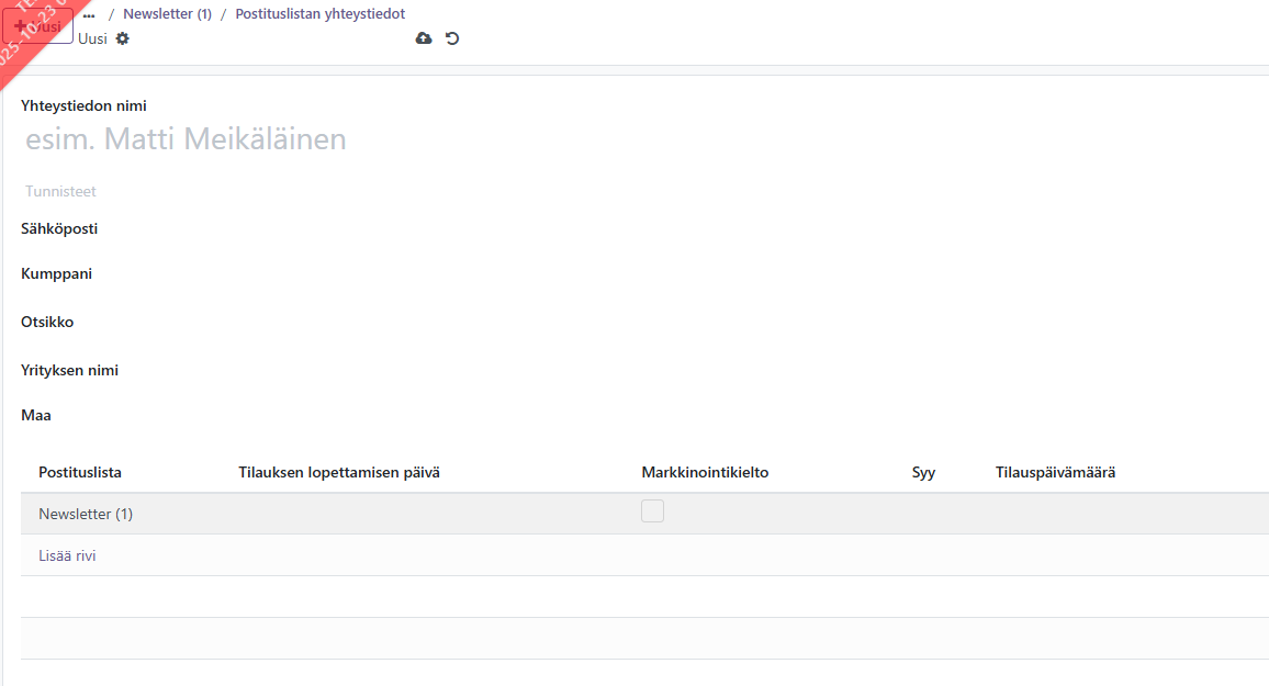 Täytä tähän tarvittavat tiedot. Sähköposti on ainoa pakollinen yhteystieto. Lisää haluamasi postituslista(t) painamalla Lisää rivi. Voit lisätä tilaukselle myös automaattisen päättymispäivän.