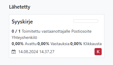 Perusnäkymässä postituksesta kerrotaan sen perustiedot: Postituksen nimi, lähetysaika, monelleko se on toimitettu ja kuinka hyvä vastaanotto sillä on ollut. Jos lähetystä ei ole vielä tapahtunut, ei näitä tietoja näytetä.