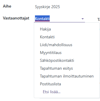 Voit valita postitukselle vastaanottajaksi valmiin postituslistan tai hakea ja suodattaa vastaanottajia haluamillasi kriteereillä valitsemassa kontakteja esimerkiksi liideiltä, myyntitilauksilta, tapahtuman rekisteröinneistä tai suoraan kontatkeista.
