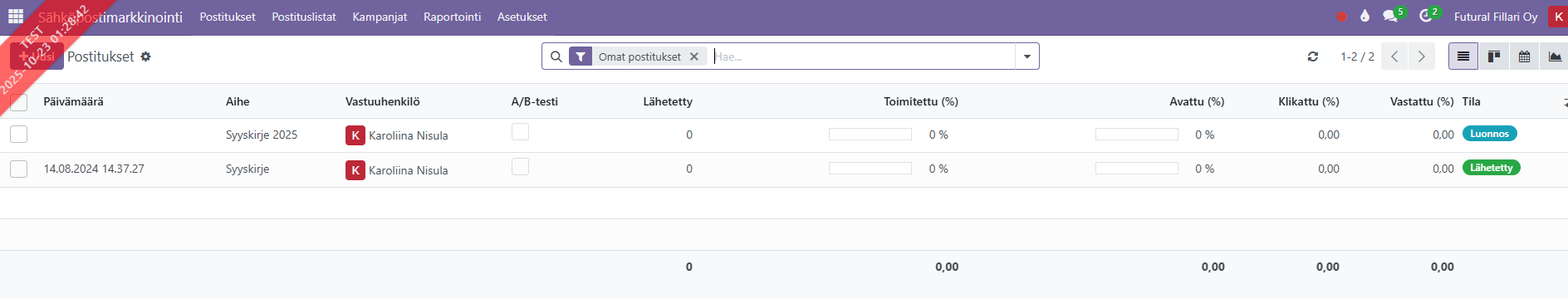 Valikosta Sähköpostimarkkinointi näet kaikki luodut markkinointiviestit ja pääset muokkaamaan niitä ja luomaan uusia.
