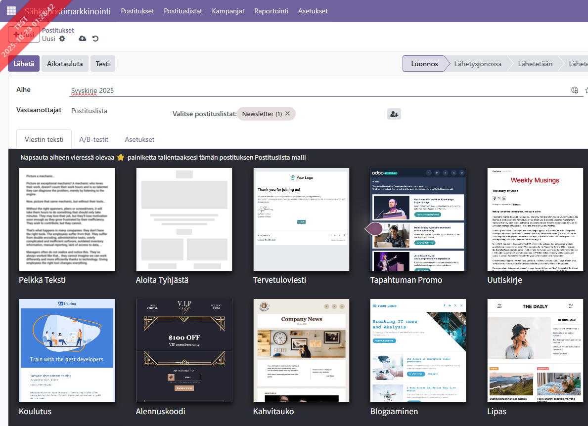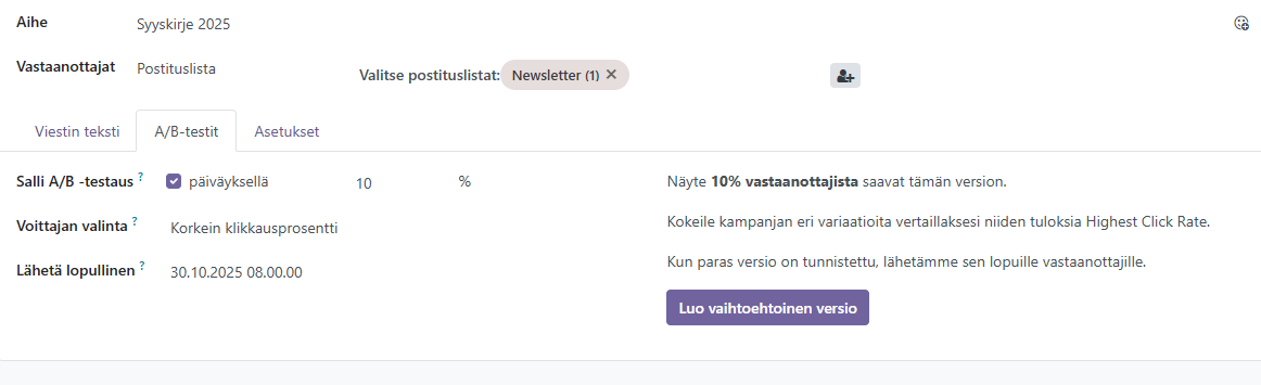 Kun testiaika päättyy, Odoo valitsee automaattisesti parhaiten suoriutuneen version ja lähettää sen lopuille vastaanottajille. -