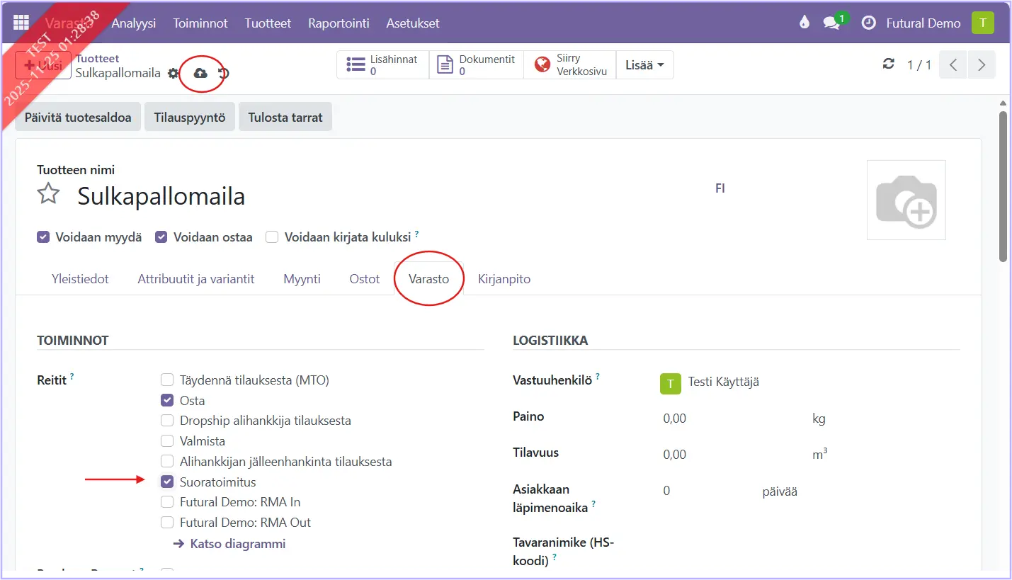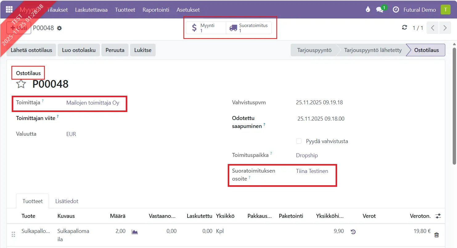 Suoratoimitettavaksi merkitty tuote menee myyntitilauksella oletusarvoisesti suoratoimitukseen ja luo tuotteesta ostoehdotuksen, eli ostopuolen tarjouspyynnön. Huomioi, että tuotteelle pitää olla määriteltynä toimittaja, jotta järjestelmä tietää, mille toimittajalle tarjouspyyntö täytyy kohdistaa. (Katso ohje: Hankintapyyntö Ostot -osiossa)