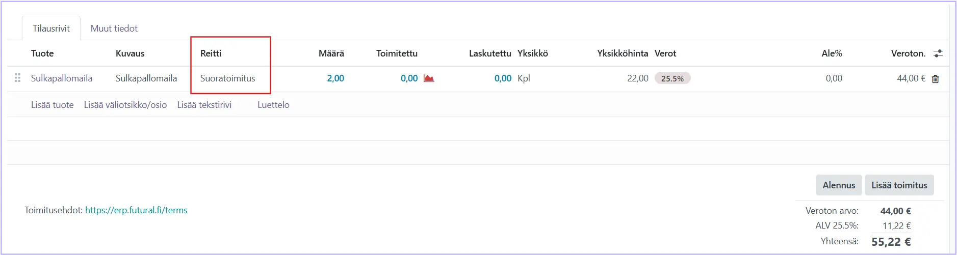 Järjestelmäasetukset voidaan tehdä myös siten, että reitityksen valinta sallitaan myyntitilauksella. Tällöin myyntitilausrivillä on kenttä "reitti", johon voidaan valita "Suoratoimitus".