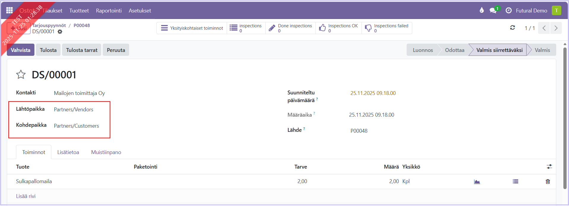 Tarjouspyynnön toimitusosoitteena on myyntitilaukselle asiakkaaksi merkitty yritys. Kun vahvistat tarjouspyynnön, siitä syntyy varastodokumentti. Huomioi, että vastaanottajana on "partner location/customers", eli vastaanottavan asiakkaan varasto, ei oma varasto. Tavara on menossa toimittajalta asiakkaalle. Tämä dokumentti näkyy nyt myös myyntitilauksella (rekkakuvakkeen takana).