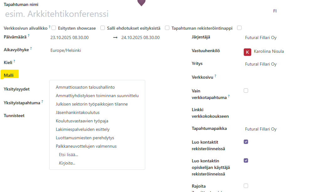 Tapahtuman mallipohja luodaan “Tapahtuma” > “Tapahtuman mallipohjat” > “Luo”