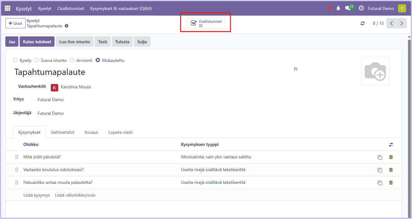 Tässä näkymässä kyselyä voidaan muokata. Nyt valitaan yläosan kuvake Osallistumiset.