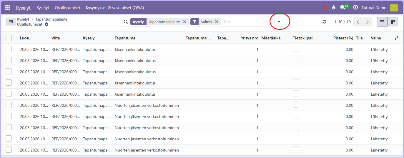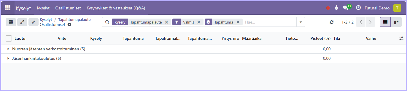 Jokainen vastauskerta näkyy omana rivinään tässä näkymässä, selvyyden vuoksi näkymä kannattaa vielä suodattaa tapahtumittain. Valitaan hakukentästä ryhmittely Tapahtuma.