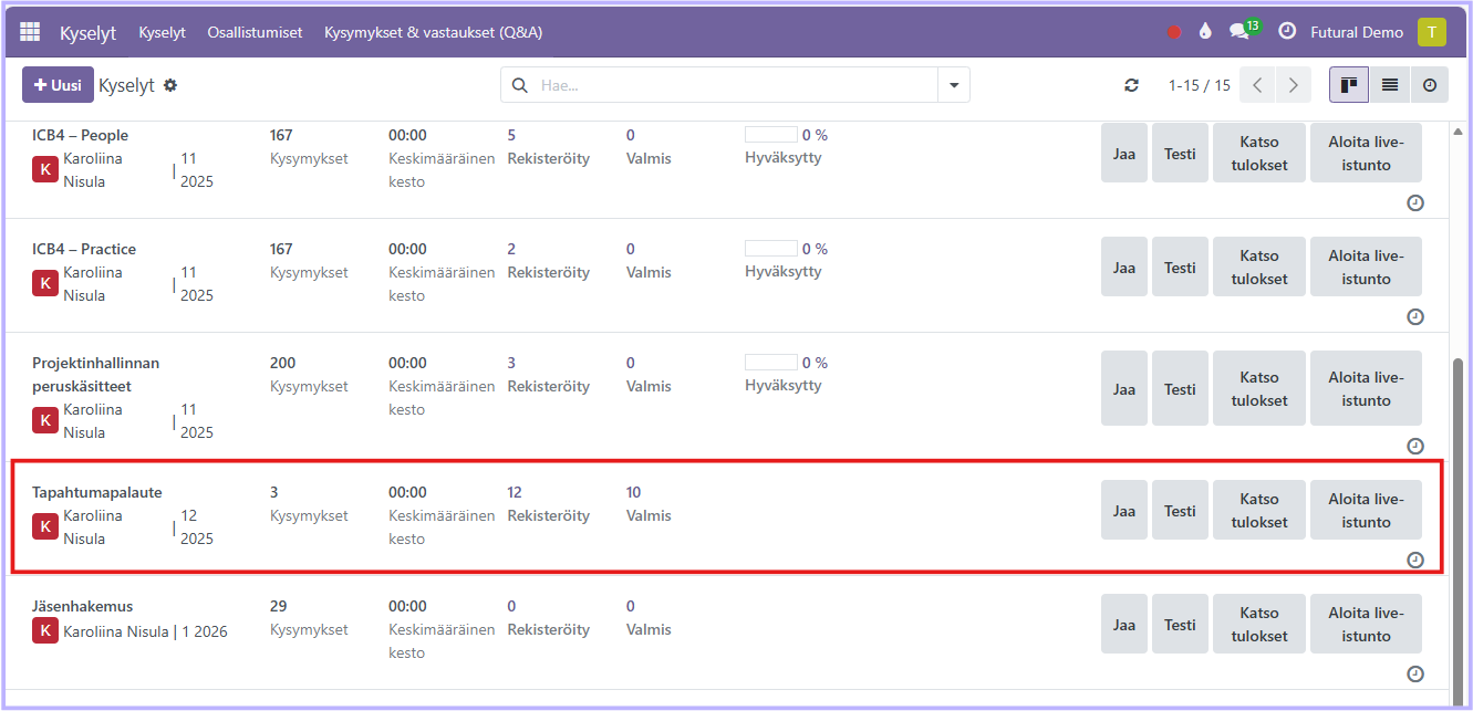 Avaa kyselyt ja valitse Tapahtumapalaute listasta sitä klikkaamalla.
