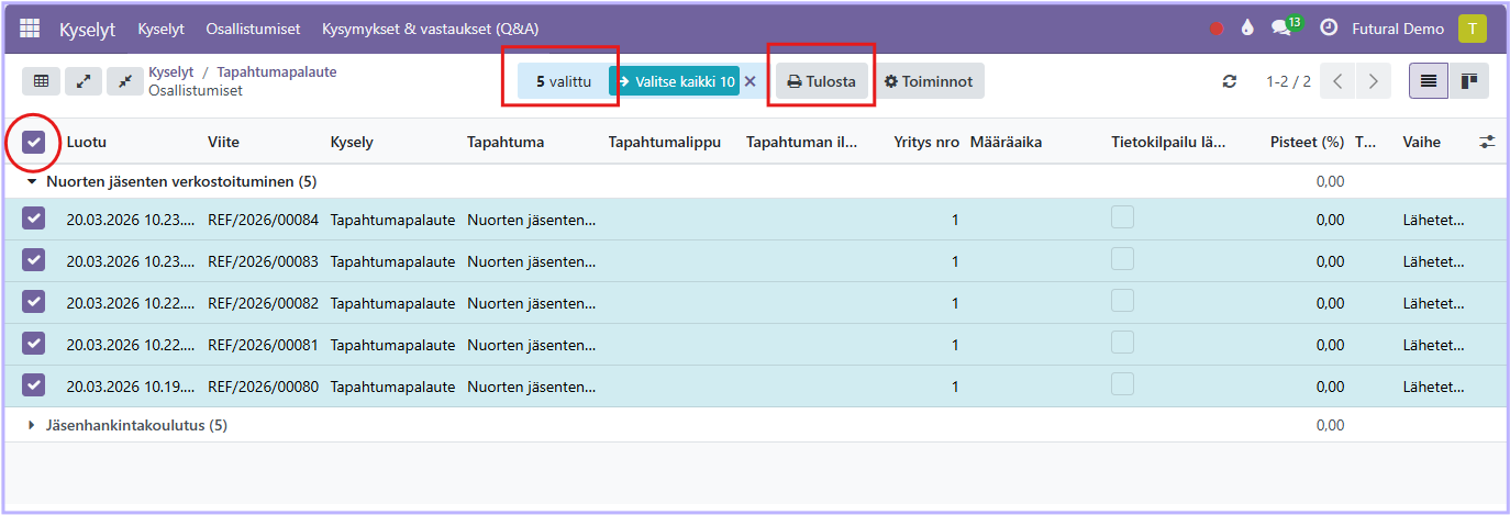 Jos vastaukset tietystä tapahtumasta halutaan viedä Exceliin, avataan tapahtuma rivit, valitaan rivit aktiiviseksi, painetaan tulosta ja Tulosta kyselyn osallistumiset exceliin.