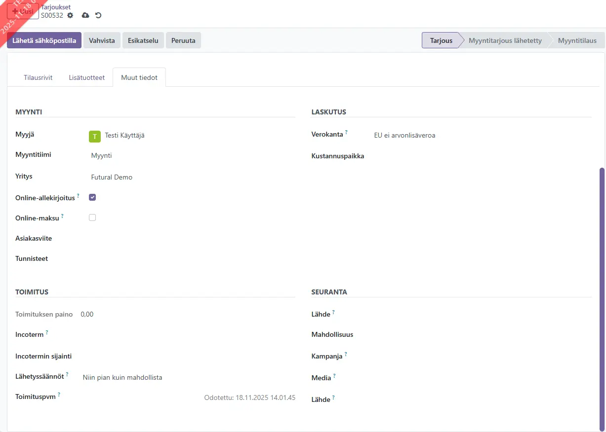 Futural ERP:ssä myyntitilauksesta luodaan ensin tarjous, joka vahvistetaan myyntitilaukseksi.