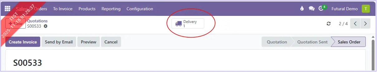 Kun Confirm/Vahvistat myyntitilauksen, se siirtyy Sales Order/Myyntitilaus -vaiheeseen ja siitä tehdään automaattisesti toimitustilaus varastolle. Toimitustilaus näkyy ruudun yläosassa rekkakuvakkeen takana merkinnällä Delivery 1/Toimitus 1.