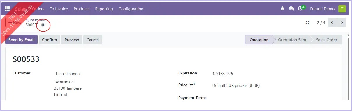 Oikea yläkulma kertoo missä vaiheessa tarjous on: Quotation/Tarjous - Quotation Sent /Myyntitarjous lähetetty -Sales Order/Myyntitilaus
