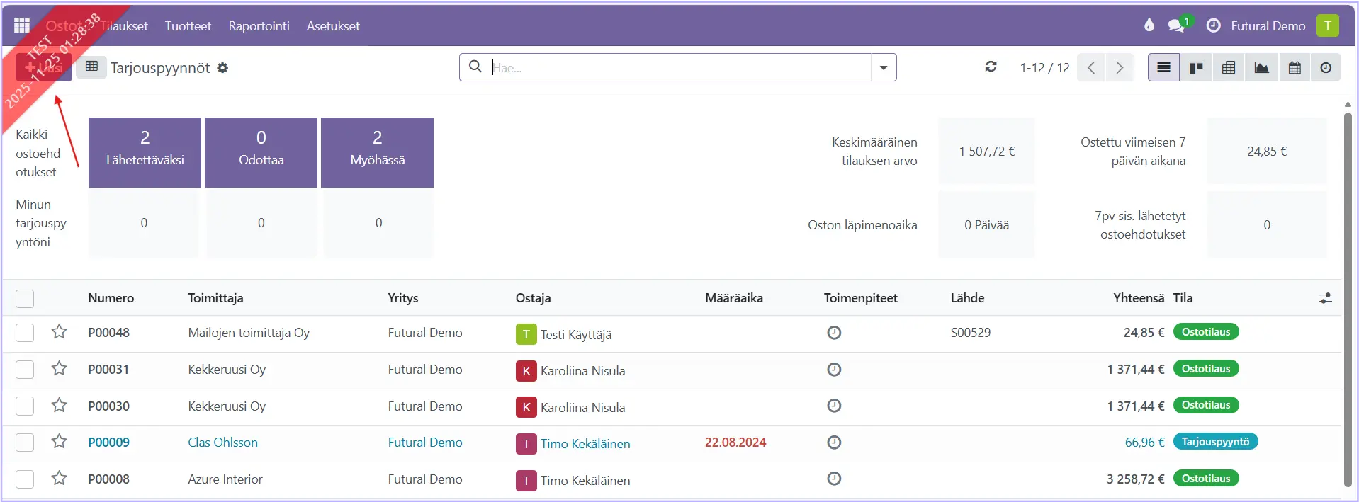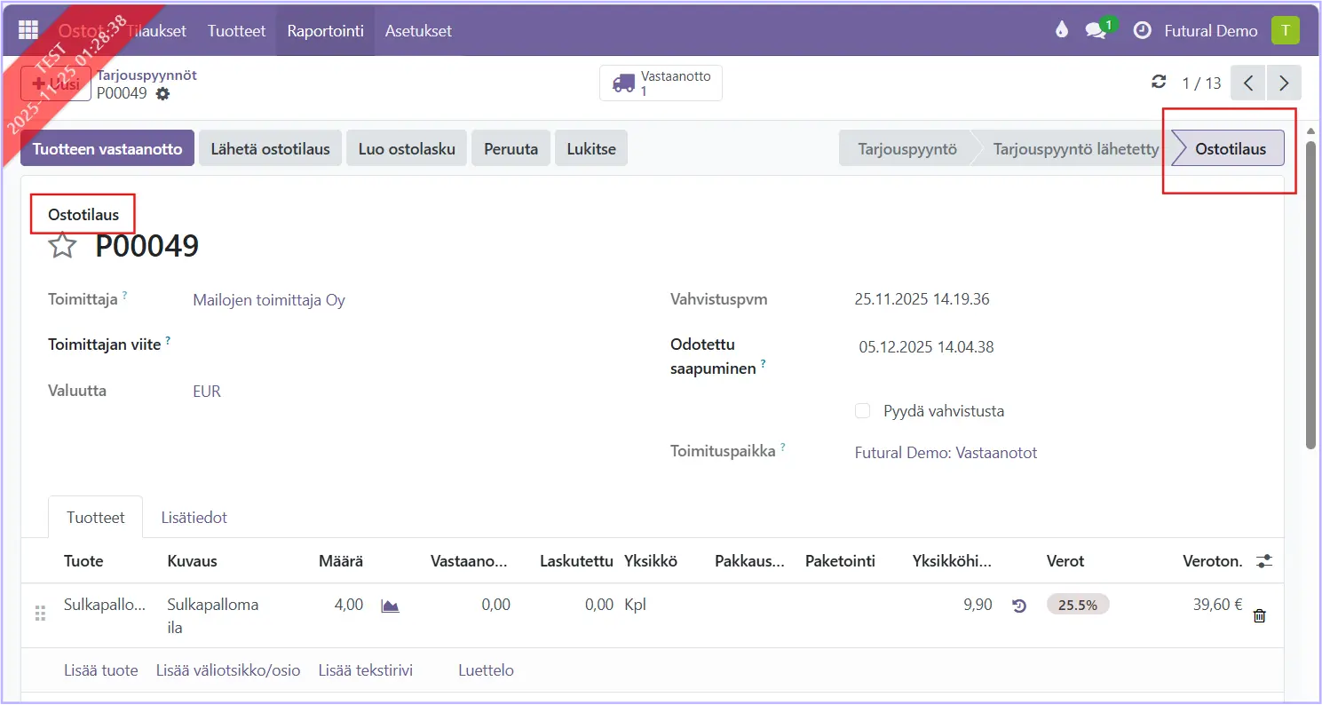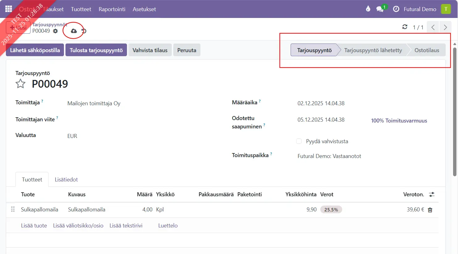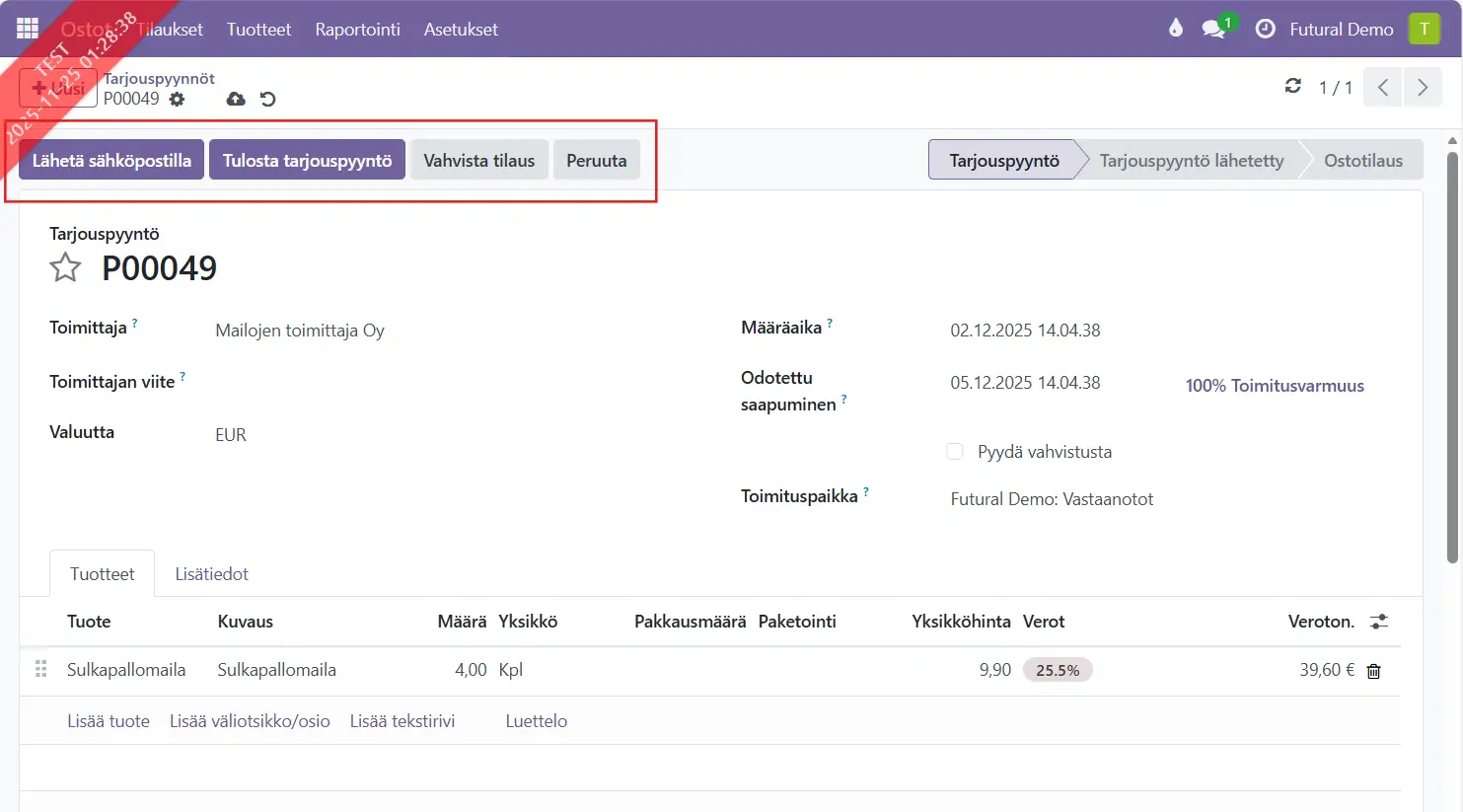Futural ERP:ssä ostotilauksesta luodaan tarjouspyyntö, joka vahvistetaan ostotilaukseksi.