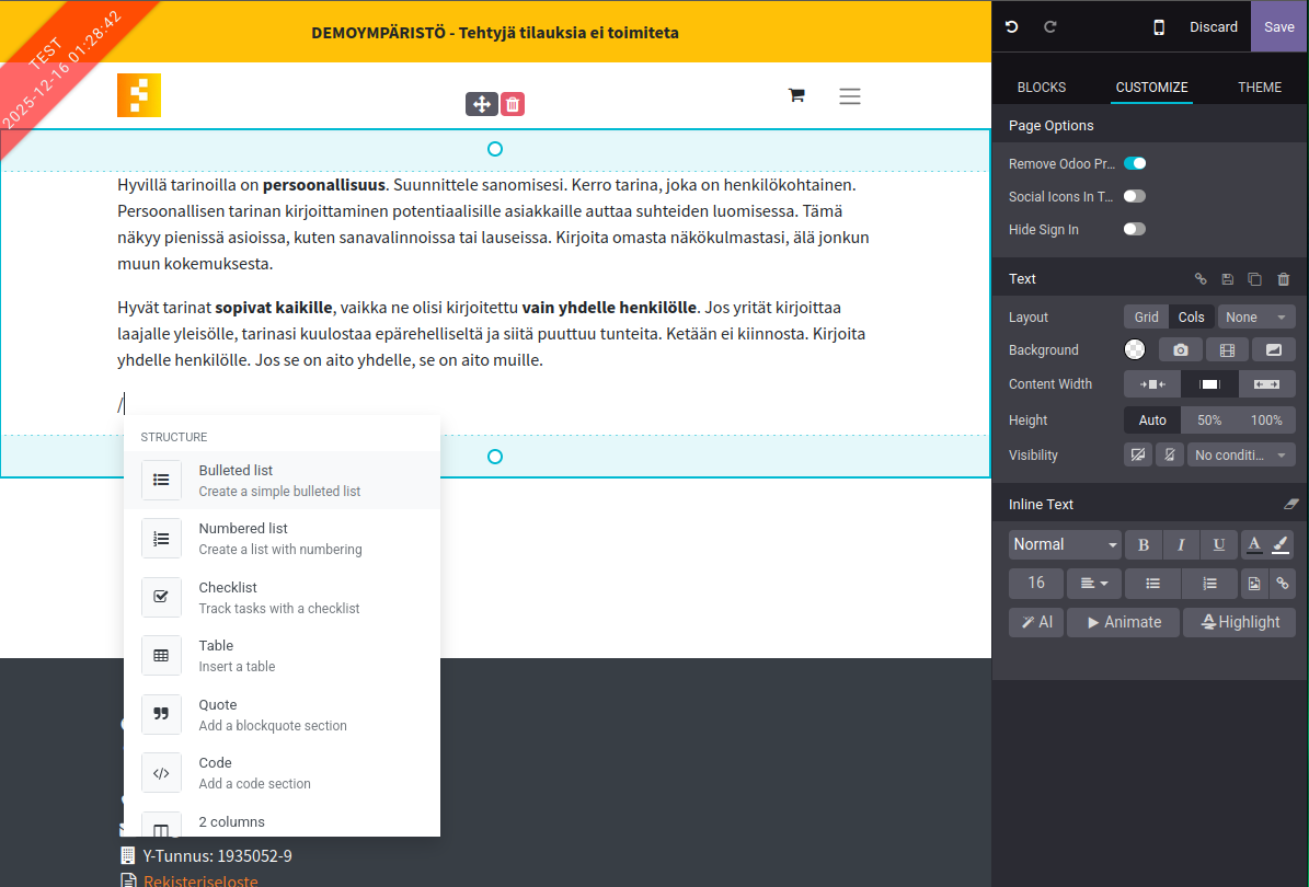 Osioon voidaan lisätä kuvia,tekstiä ja muita elementtejä, ja näin luoda halutunlainen julkaisu oikean reunan palikoita hyödyntämällä.