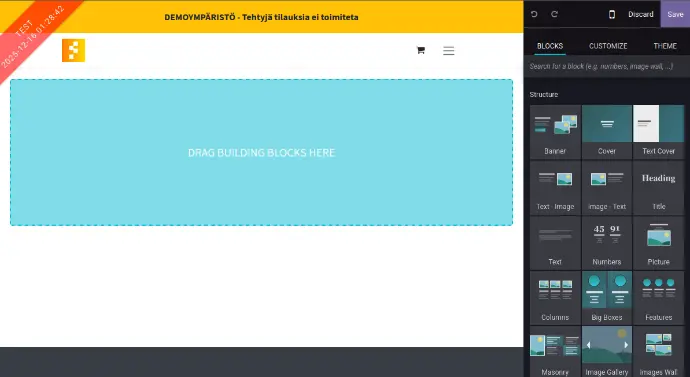 Vedä haluamasi elementti Drag building blocks here -kohtaan ja tee haluamasi muutokset tekstiin ja kuviin.