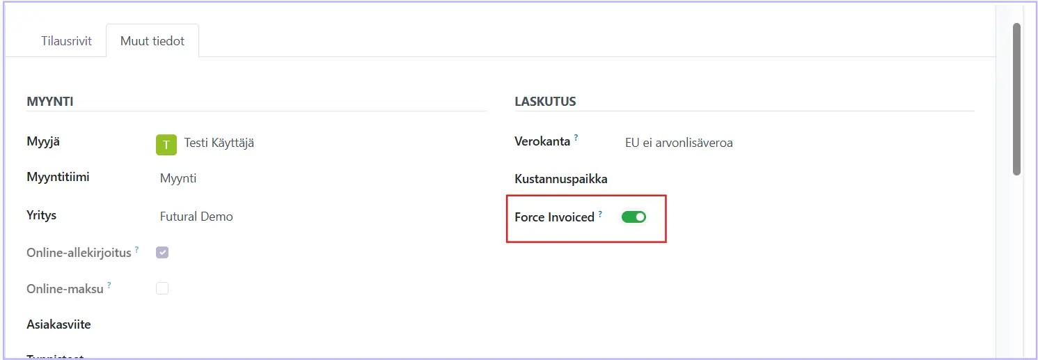 Välilehdellä Muut tiedot, klikkaa liukukytkin Force invoiced (pakota laskutetuksi) aktiiviseksi.